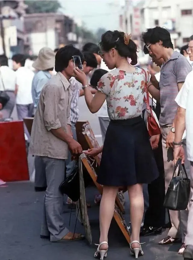 那时候没有什么专门的美妆店,姑娘们逛大街饿了渴了,鞋跟一跷,随手拿出一面小镜子就开始补个妆,小小的折叠镜一翻,阳光下映得人脸都亮堂起来,这种路边照镜子,真是七八十年代才能看到的松弛感。