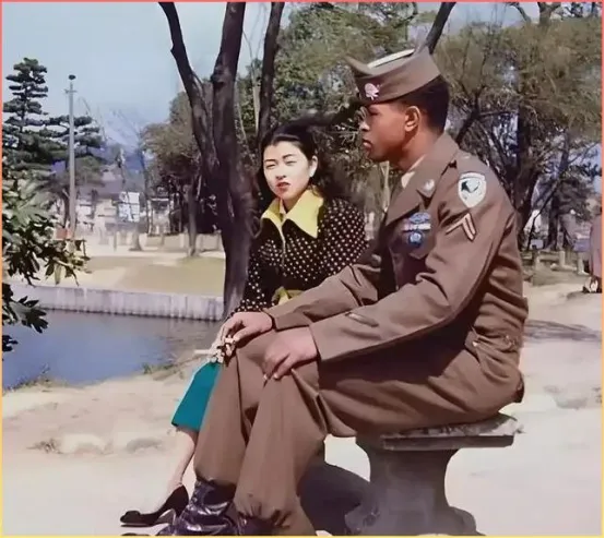 再看这张,一对情侣坐在公园的长椅上,背景是清澈的池塘和远处的山景。韩国姑娘穿着那个年代流行的波点上衣和蓝色裙子,而美军士兵则是一身笔挺的军装。他们并肩而坐,姑娘手里还拿着本子,不知道是在聊什么话题。这样的场景在当时的韩国并不罕见,美军驻扎带来了文化碰撞,也催生出许多跨国恋情。有的开花结果,更多的只是过眼云烟。