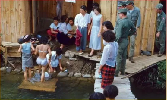 这张照片最有意思!一群人围在温泉边上,有大人有孩子,还有穿着军装的美军士兵。木质的台阶和简易的设施,透露出那个年代韩国百姓的生活状态。孩子们光着脚丫子在水里玩耍,大人们在旁边看着笑着,这样的场景让人感受到战后难得的轻松氛围。虽然生活清苦,但人们还是要找点乐子,继续往前走啊!