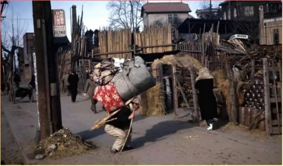 这张照片格外特别!一个韩国男人在街头弯着腰背着大扫帚,周围是破败的街景和简陋的木栅栏。这反映的是当年韩国底层百姓的真实生活状态。那个年代,为了生计什么活儿都得干,尊严有时候抵不过一口饭。远处还能看到其他路人和店铺,整个画面充满了市井气息。历史不总是宏大叙事,更多时候就是这些小人物的生存记录。