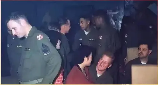这张照片拍的是室内场景,一群穿着制服的美军和韩国妇女聚在一起,气氛看起来挺热闹。前景中坐着的两个人笑得特别开心,能看出来当时的氛围很轻松。这样的聚会在驻韩美军中很常见,有的是正常社交,有的则带着其他目的,具体是什么情况,看照片中人物的表情就能猜个八九不离十了。