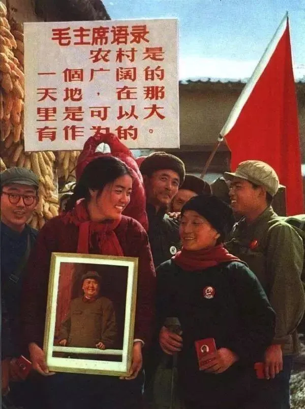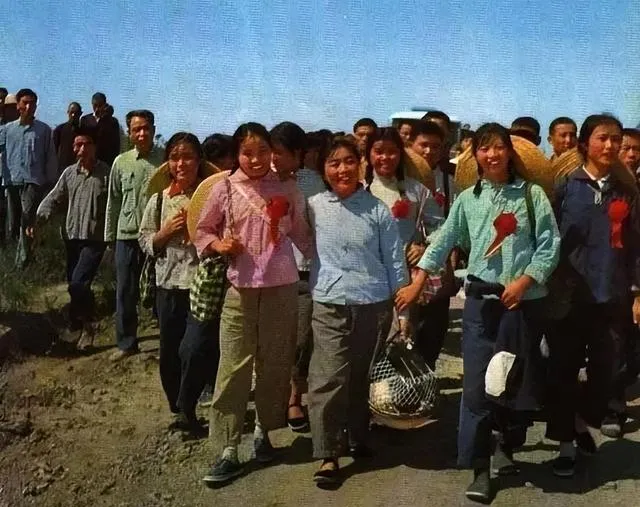 这一张啊,最抢眼的是手里的像章,怀里的语录本,举过头顶的毛主席像,一群说说笑笑的年轻人,刚下到农村没多久,眼里还都是城里的劲头,脸上那股朝气顶不住的透,“广阔天地,大有作为”,口号喊得响,那时谁不觉得能干成点大事。红围巾一系,胸前别着大红花,人群里带队的阿姨乐呵开口:“姑娘们,咱这活就当大操练”,底下就哄笑一片。那时候的姑娘,一个比一个精神。