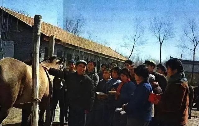 牲口栏边围着一圈知青,手里抓着簿本,边记边问老队长怎么给马喂料、打蹄铁。第一次摸到真正的农村活,姑娘小伙眼里全是新鲜劲。