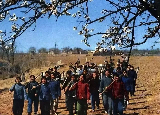 花枝底下,一溜人扛着铁锹、锄头,大家伙迎着早晨的风就赶到地头。队长一挥手,“今天开春,咱们要干个翻天”,小姑娘们全都乐开了花。