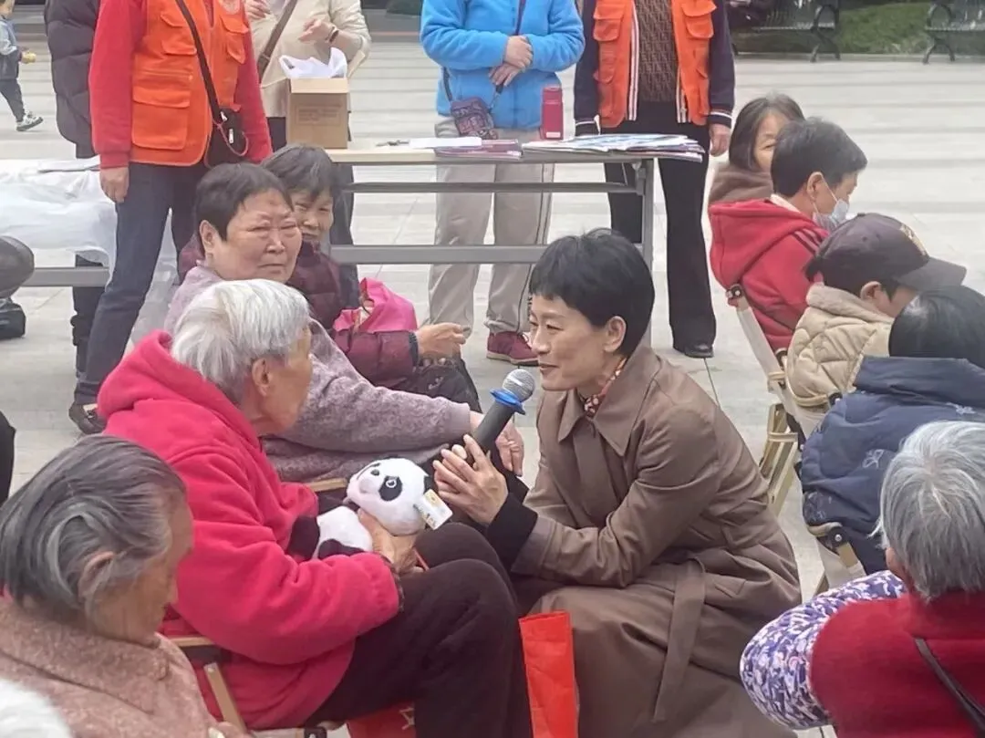 活动开场,读者报社、看熊猫杂志社策划总监伊蕤来到现场,代表单位为长寿苑社区无偿捐赠全年报刊杂志各一份。《读者报》创办于1994年,以“服务书香天府、助力全民阅读”为办报宗旨,聚焦全民阅读、传播中国故事、弘扬优秀传统文化,服务“一老一少”阅读需求,是四川报道全民阅读活动的重要阵地。报刊内容涵盖有封面/专题栏目(热点深度、文化策划、节气/非遗、家风)、文史/旧闻栏目(历史事件、人物、考古、档案)、阅读/书香栏目(书评、作家、书单、全民阅读报道)、人物栏目(名家、匠人、非遗传承人、时代人物)、养生 /健康栏目(中医、养老、慢病、心理)、天下/环球栏目(国际、地缘、海外史、异域文化)、副刊/ 潮头栏目(散文、诗歌、小说、随笔),全方位满足不同年龄段居民的阅读需求。《看熊猫》杂志是国内唯一以“大熊猫”命名的青少年读物,面向7-15岁中小学生,融合科学探索、自然美学与成长教育,通过沉浸式“国宝”探秘、生态课堂等内容,点燃孩子的科学好奇心,感受自然美学与生命力量。