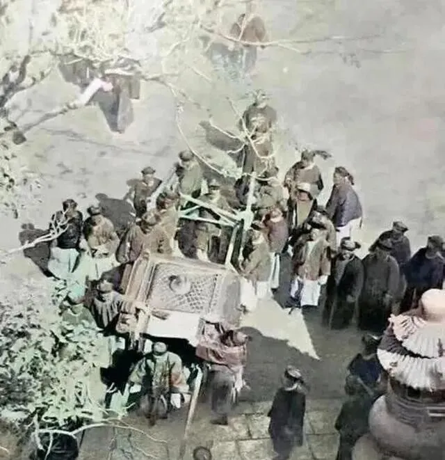 图中这一堆人里,轿子里的就是光绪皇帝,别说见他正面,就连侧脸都像捡漏,模模糊糊糊地远远抓拍一张,这可是他一辈子唯一一张公开照,大清末年,皇帝当得像个影子,威风都给慈禧老太太拿了去,连露脸的机会都没有,那张轿帘,拉得比大门还严。