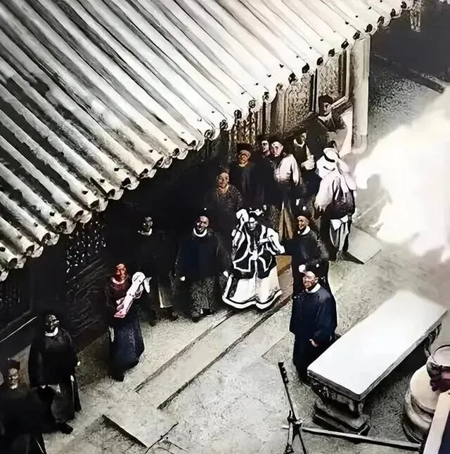 说到慈禧太后,那气派就不一样了,这张是她风风光光回紫禁城的时候,前呼后拥,身边人都陪着,谁敢不笑脸相迎,站在边上的女眷们一个赛一个地恭敬,照片的光一照,都是明晃晃的权力味儿。