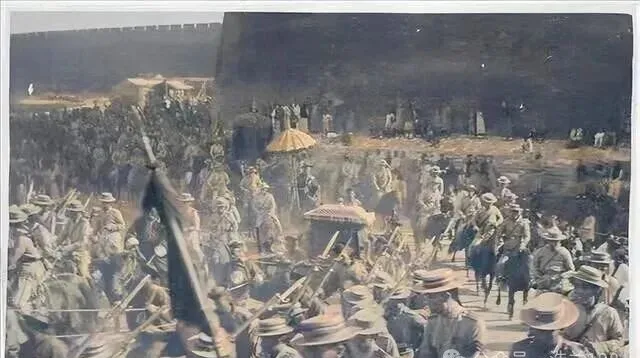 照片里能看清的,前头一堆士兵,帽檐低垂,后边是北京的城墙和人群,八国联军进京那年,差不多算大清最灰的一页,老百姓全缩着脖子。旗子风里晃,一圈外国兵压着阵,有人远远看,有人躲着不敢出门,那个黄伞傍身的官,也说不好心里有几分慌。