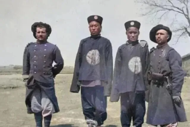 四个人,队形整齐,两头是外国兵,中间两个是大清巡捕,身上的圆补牌子亮得晃眼,帽子齐刷刷往下一压,拍照那天应该是个晴天,路边草色青青,背景里无声却很有风头。