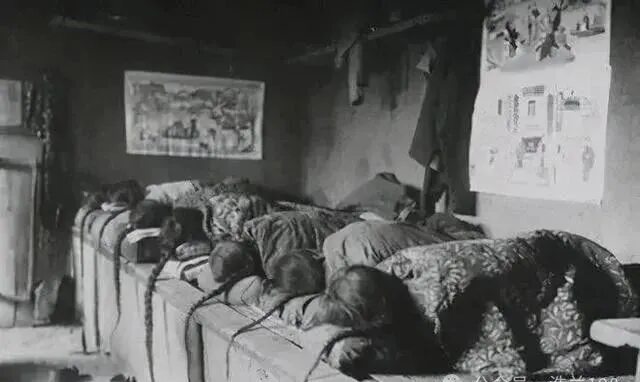 一排人头埋在厚被子下,大通铺的热闹,那种土炕是老北方冬天的标配,晚上各家孩子挤一炕,头靠头,脚乱踹,墙上贴年画,屋里弥漫着炕烟和热气,窗外冻得滴水成冰,屋内却混着汗味和鼾声。