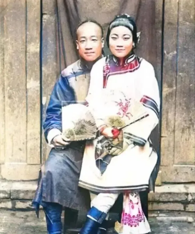最后放这对新人的合影,女人穿得扎扎实实,一身嫁衣,手里还拿一把扇子,男人斜斜地靠在边上,脸上带点腼腆,这种老式结婚照是一辈子的纪念,衣服做工特别鲜亮,袖子上压着红边,布料都是绸缎,头上饰品也没落下。