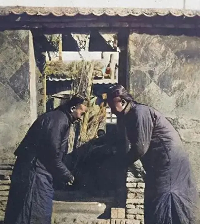 看这两个人,在院门口低着头,正在弄什么,这物件叫连枷,竹木杆子拴着,专门打谷子用,力气全压在手腕和肩膀之间,秋收时候我爷爷讲过,打场上最怕手没劲,连枷一下提不起来,全队人扯着嗓门催,有的人累得手脱皮,能干到底的都是巧力气,冬天连枷放在屋檐底下,没人会多看一眼,可到夏秋一到,家家户户离不开它。