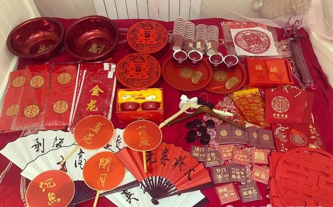 这摊鲜亮的红,都是旧社会新娘子的嫁妆,盆、碗、扇、囍字、礼金簿,密密麻麻摞满一床,奶奶讲过去嫁姑娘,彩礼讲究里里外外都得红,箩筐要有,铜镜不能少,扇子要写几个好听字样,大户人家这阵仗铺出来倍儿有面,亲戚邻居围着看图喜气,现在嘛,婚礼讲求新潮,红铜盆都成古董了,但那股子成家立业的热闹劲儿,一点都没丢。