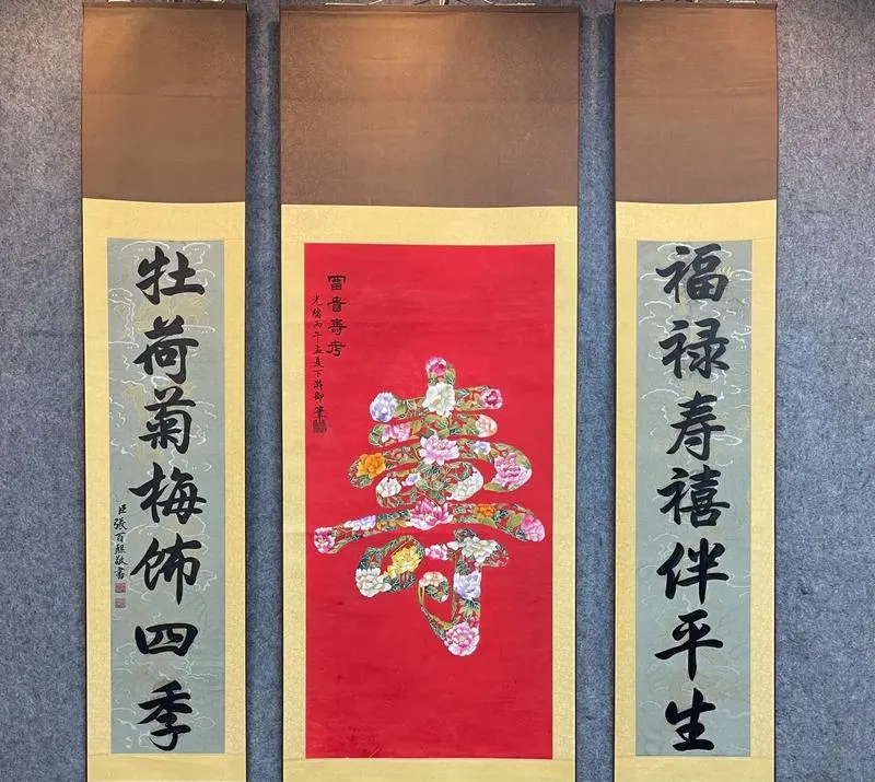 这三幅并排挂着的,就是清末寿屏,中间一大个“寿”字,左右两头写着赋诗,底色大红,花团锦簇中藏着祝福,讲究人家给老太太过生日,少不了这么个屏风,小时候看老人过寿,桌子上多摆点槟子果,几个菜不算啥,能请来寿屏就是风光,寿字写得好,邻居还得借去铺堂口,现在好多人寿宴图热闹,屏风嘛,多半搬进了博物馆里,少了点那种庄重带着吉气的味道。