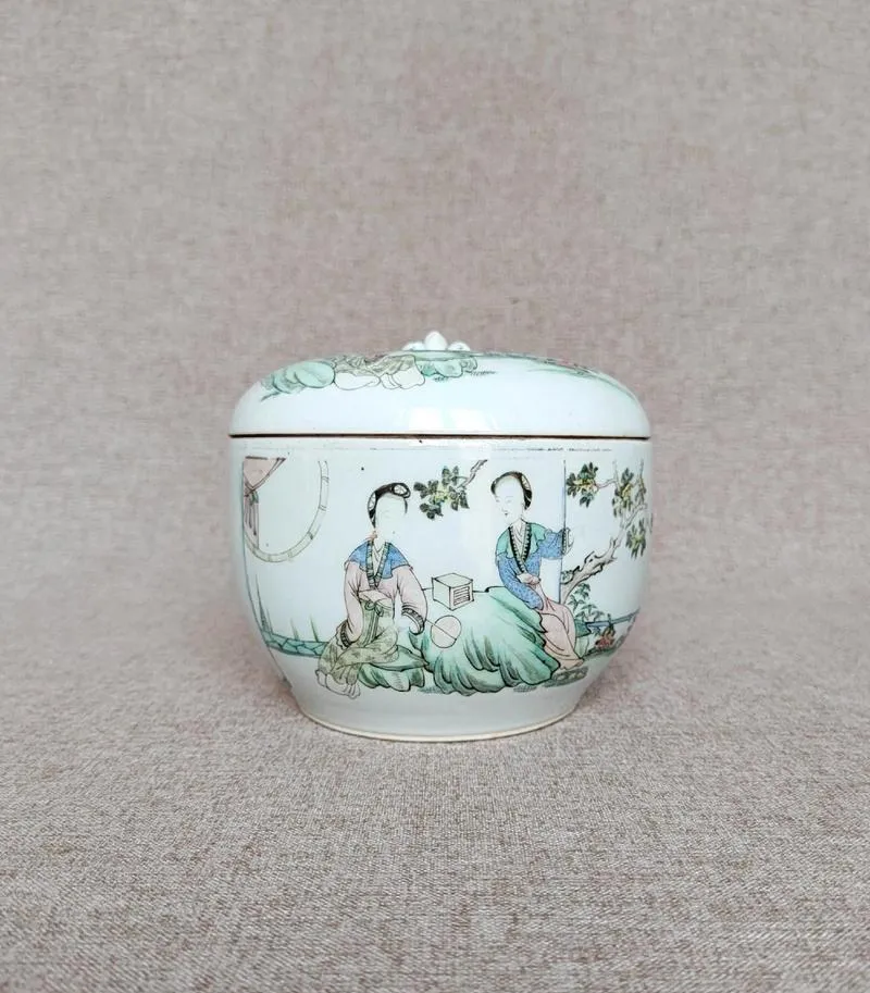 这个圆鼓鼓的东西叫绣画人物瓷盒,白瓷底上坐着两位仕女,神态安静,边角刷两道绿叶,边上常年摩得发亮,据说是放首饰或胭脂的,小时候我打翻过外婆的瓷盒,盒里头香香的粉扑被我搓成一团,奶奶气呼呼捏回来,瓷还是亮的,可盖子崩缺了角,她只说,这种盒子耐看不耐磕,家里留一个当存念,现在的用塑料盒了,花都印歪了,不比老物件结实。