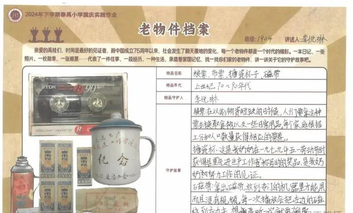 有意思的这一摞纸,是小朋友写的老物件档案,录着搪瓷杯、磁带、香烟老包装,一个个编号写得清清楚楚,内容里全是自己家老人的事情,记忆就这么传下来了,档案这种东西,过去市井人家看不上眼,现在学校却教孩子写,时间转了圈,老物件留在纸上,倒成了新鲜事儿。