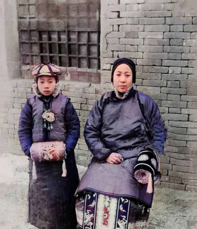 这张照片里满服的母女俩,脸冻得泛红,娘身上的绣花护膝,女儿怀里攥着团绣球,都是不见经传的细节,小孩耳朵上钉着铜环,大人宽袖长袄拖到鞋面,站在青砖墙下,明显不是一般人家的日子,小时候邻村有个老太太就是这么穿着,冬天冻毛裤搁不下去,全靠絮棉袄,如今城里娃一晒太阳就喊热,这铺张的冬装是真难见了。