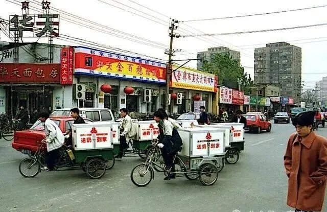 其实那阵北京街头最经典的画面,就是一排排送奶三轮车穿梭过大街小巷,白底红字,车厢里咣当咣当都是奶瓶儿,每天早晨,还没睡醒就听到外头铃铛响,小哥们边踩边喊:送奶啦,孩子出来接奶了没。有时候一打滑,奶瓶子摔碎一地,奶味儿和泥味就这么混一块,旁边大妈附和一句:这年头喝奶的孩子福气,不比我们小时候,哪舍得呢。