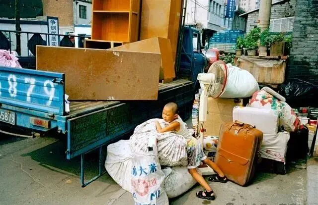 一车杂物一床被褥,小孩趴在被堆上,半躺半睡,边上是大人忙活,可能是搬家,也可能是妈妈临时出门,小家伙一点都不嫌乱,反倒把这里当堡垒。八九十年代搬家,都是这种临时阵,邻居过来帮手,没谁计较多抱一包少拿一袋,手忙脚乱里面都是实在劲儿。