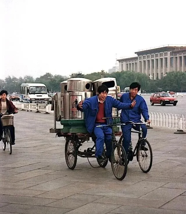 这张三轮车拉着几只大铁罐,两个工人并排骑行,那阵北京最常见的画面,就是蓝色的工人衣和沉甸甸的货,地面都是石板,前头小喇叭一响,路过的汽车让一让,谁都习惯了城市和劳动混在一起的声音。现在路上遇见维修工,已经很少是踩三轮这样的排场了。