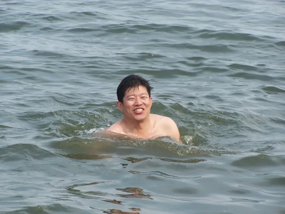 饭后,阳光正好,微风不燥。我们一行人沿着小路,来到水库栈桥附近,彼时的峡山湖,碧波荡漾,水光粼粼,阳光洒在湖面上,折射出细碎的金光,远处的山峦连绵起伏,与湖水相映成趣,风光无限美好。那时候的栈桥,管理还没有现在这么多规矩,少了几分约束,多了几分自在。同行的两个会水的同学,借着酒劲,一时兴起,褪去外衣,一个猛子便扎进了清凉的湖水里,肆意地嬉戏打闹,笑声顺着风,飘向远方。我不会浮水,看着他们玩得尽兴,心里也痒痒的,恰好附近有游泳的人带着汽车内胎,我便上前借了一个,在水里瞎扑棱,感受着湖水的清凉,同行的其他同学给我们按下了相机快门。