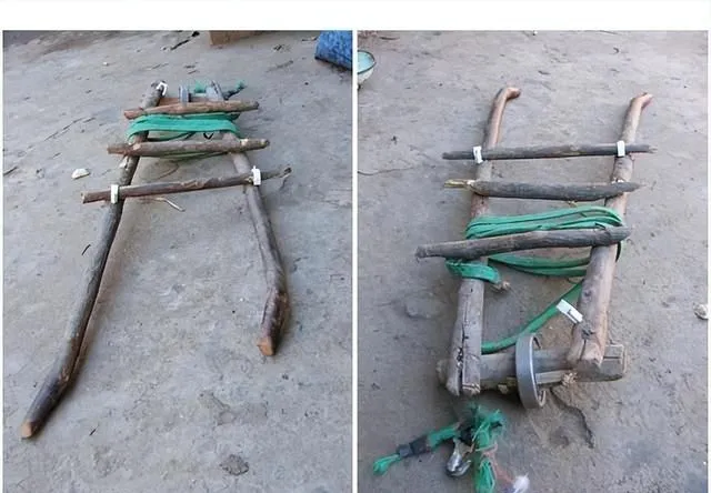 这个用树杈子短棍扎起来的架子车,前头缠着几圈麻绳,底下绑两轮子,庄稼汉挑水拉粮都离不开,老爷子总说,车做得结实,拖一袋苞米顶一天活,现在公路上都是大卡车,以前一辆小木车就是村里的重器,赶集拉货全靠它。