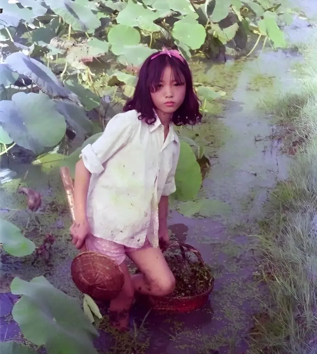图里的小姑娘就叫人难忘,身边一片荷叶田,踏在水里,裤脚早就卷得高高的,衬衫洗得发白,左手一只篾编的圆罩,右手提着小篮子,里面一半是水草一半是小泥鳅,这种场景,城里看不见,小时候村头池塘边也是这样,一群人光着脚踩进水,家里大人远远喊一句“小心别滑进去了”,小姑娘的头发被发卡卡得紧紧的,走累了就靠在荷叶下歇喘口气,等天热一点,回家路上一边甩着水一边数兜里的收获,可惜现在池塘干净的越来越少,想再见这样的娃娃和莲田,真不容易。