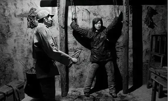 墙根下的这一幕让人看着牙疼,女战士被木架吊着,手被绑在头顶,旁边站着敌兵,屋里阴冷,地面坑坑洼洼,细节处全是岁月的涩,受刑的表情坚定,贴身的粗褛棉袄,一身灰麻,电视剧演拷打都是三下五除二,其实谁知道有多少人真这样熬下来的。