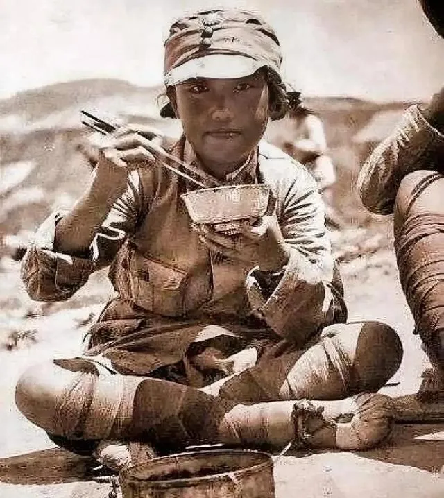 瞧这女战士盘腿坐地,左手举着饭碗,右手夹着筷子,吃得飞快,头上帽子一歪,一看就是打仗时的匆忙劲,衣服裤子都是打补丁的缝缝连,每一口饭都跟抢似的,老一辈总说,能吃是福,有口吃的就是胜利,轮到现在人,午饭点还要慢挑细选,过去哪有闲情雅致。