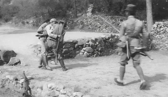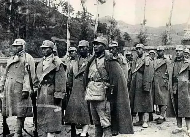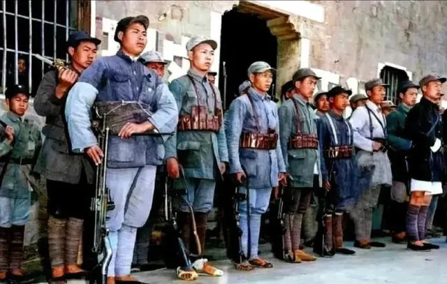 这张是三个人,身上穿的军服颜色深浅不一,一个明明穿着红军老棉袄加顶青天白日帽,看起来混搭,肩上斜背着缴获来的步枪和老旧水壶,手雷塞在带子上晃荡,左臂缠的还是布带,脸上的表情松弛下来了,好像刚结束一场激战,电视剧里你见过这样“乱七八糟”的装备组合吗,现实里可都是谁有啥用啥。