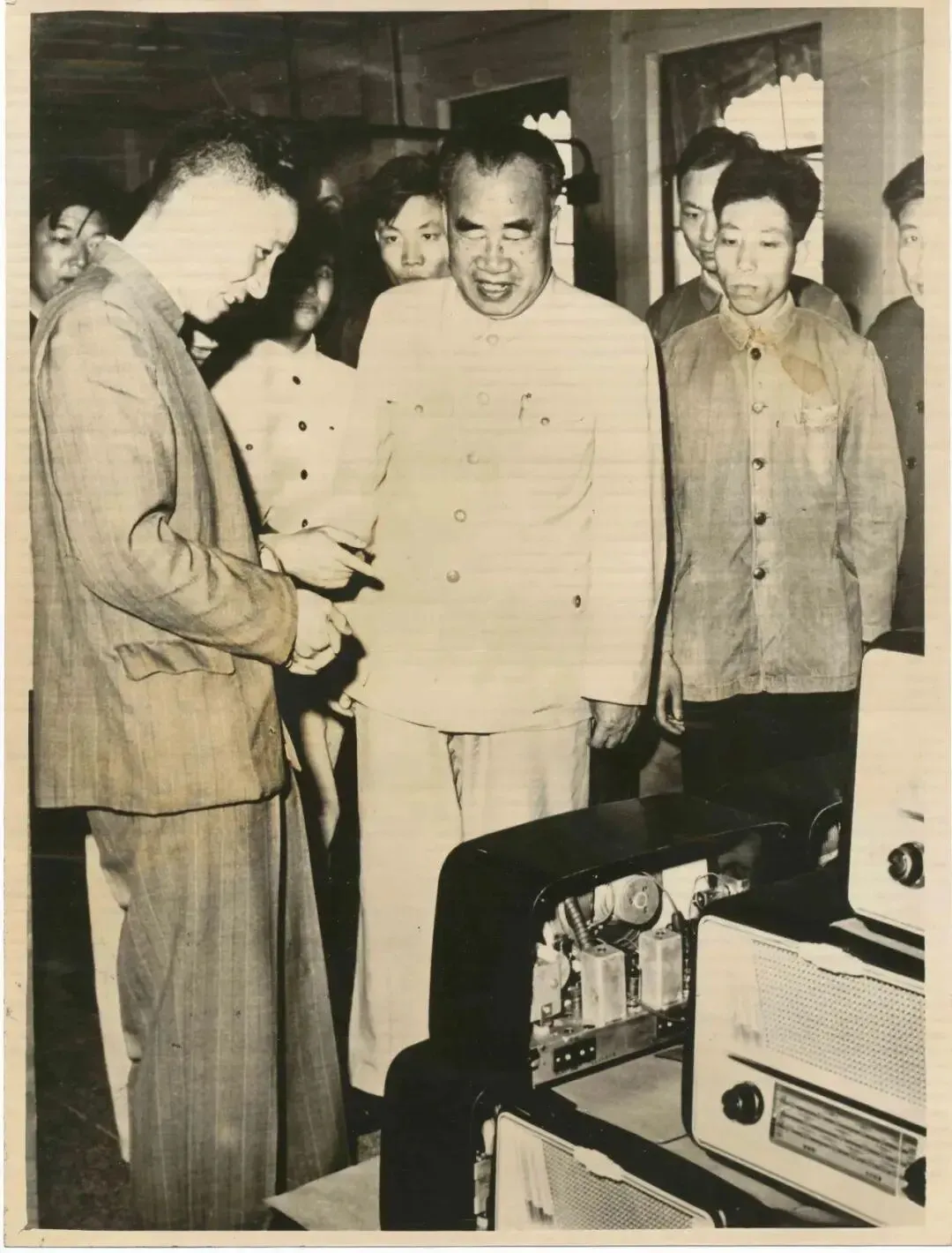朱德委员长认真察看收音机产品,与技术人员交流,定格国家领导人关怀民族工业发展的珍贵历史瞬间。