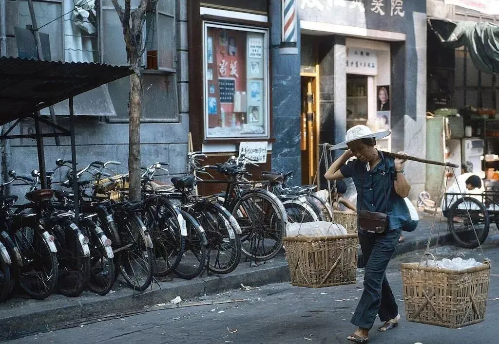 大姐挑着扁担,扁担的两头是竹筐,看起来竹筐里装的东西分量还不轻。