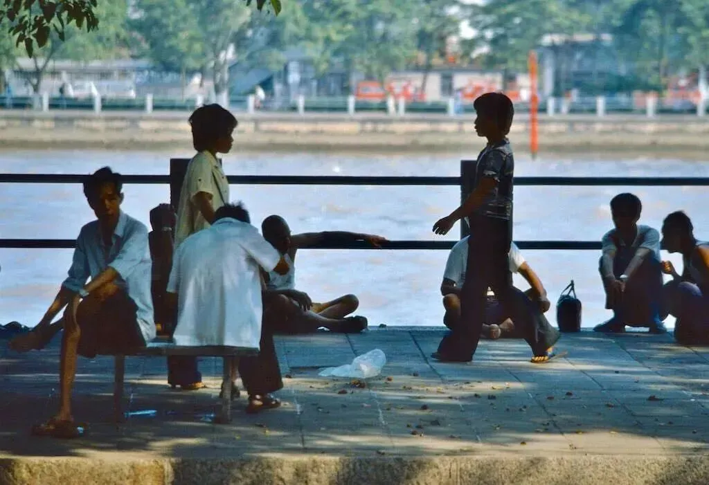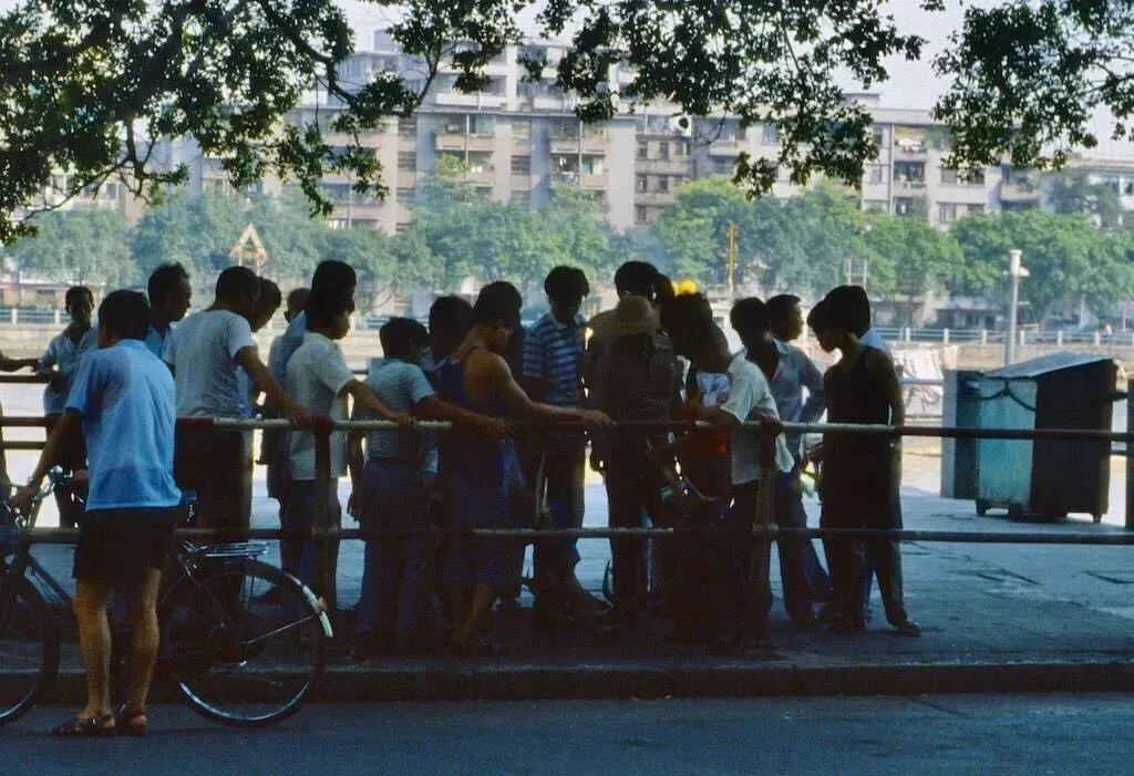 人们在珠江边休息,有的干脆直接坐在地上。地上还扔着吃完荔枝剩下的壳。