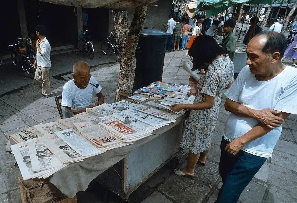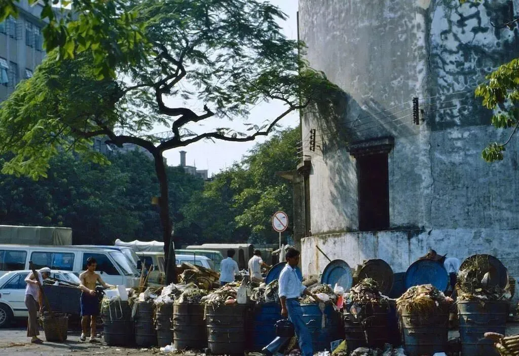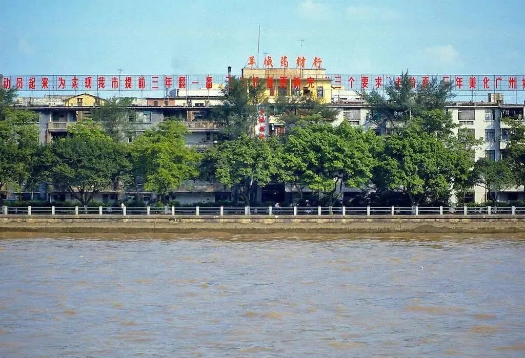 羊城药材行的大楼上,竖着标语牌:“动员起来为实现我市提前三年翻一番......”