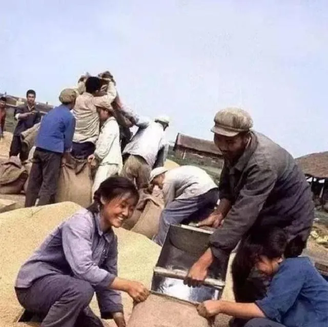 一群人扎堆分粮食,姑娘守着口袋,边笑边张罗,她的动作利索,眉眼里全是满足和奔头,那时候每一口米都不容易,姑娘们轮班帮着装粮,谁家多谁家少,心里都有数。