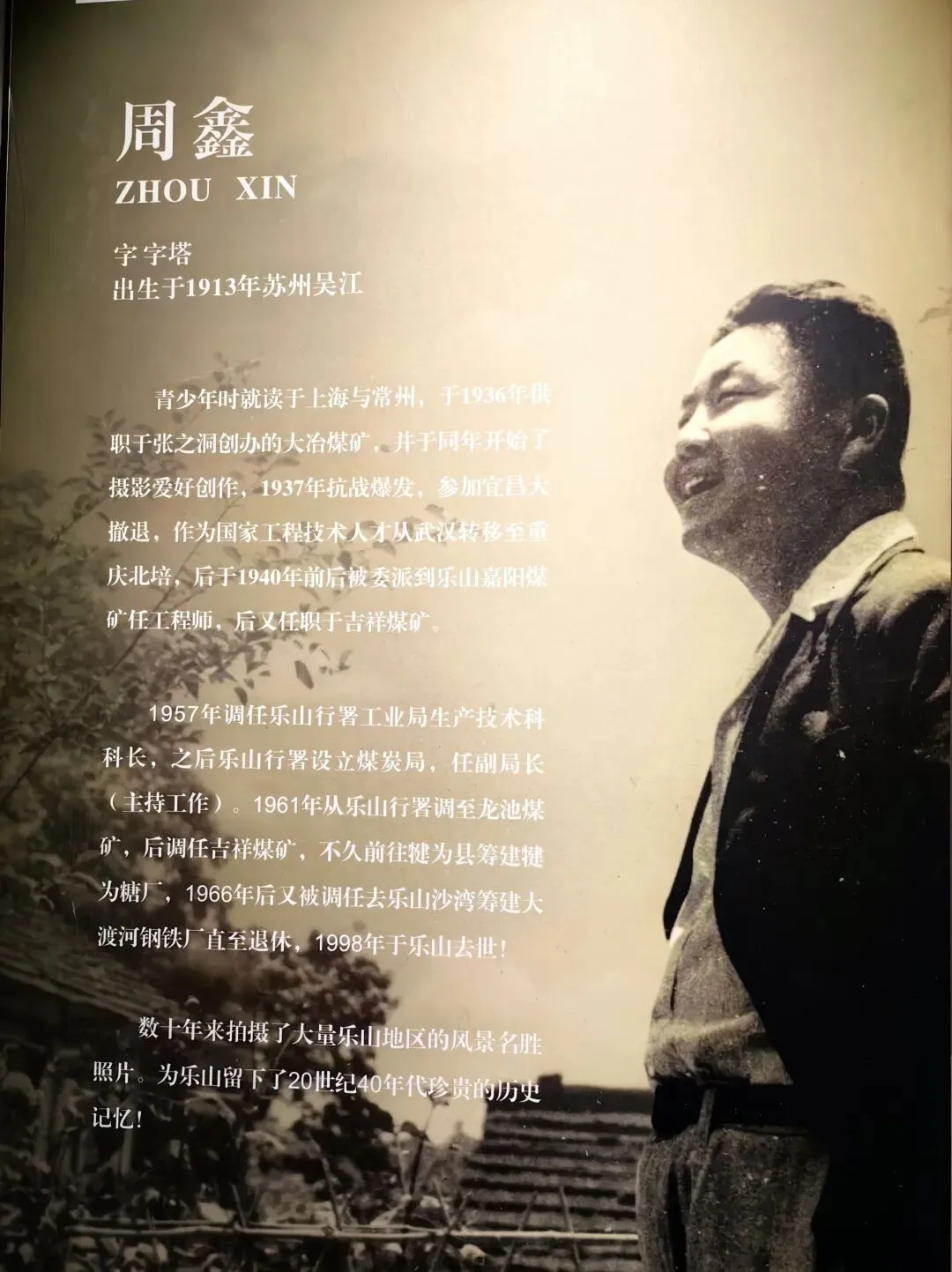 周鑫先生民国二年(1913 )生于苏州吴江,少年求学于沪上、常州,民国二十五年(1936 )任职于张之洞创办的大冶煤矿,并开启摄影创作之路。从周鑫这四十多张老照片拍摄水平看,很专业,既如实记载历史细节,还颇具美感和质感,民国二十九年(1940 )年周鑫被派驻乐山,任嘉阳煤矿工程师,后供职于吉祥煤矿。这批老照片,便诞生于这一时期,既是他个人工作生活的珍贵记录,更为乐山,五通桥,犍为,峨眉山留存下上世纪四十年代珍贵的城市史影。我喜欢收集乐山老照片,这组周鑫拍摄的老照片,很有历史人文价值。其中除了几张老照片备注详实,大多数老照片未备注详细拍摄点。一些背景较为明显的老照片,我试着备注,也许会有误差,还有一些我暂无法确定的,提出来向读者请教。