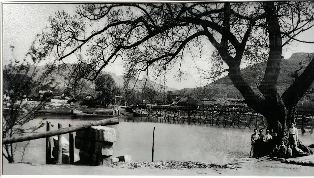 (五通桥灯笼桥和黄葛古树,周鑫 摄于上世纪四十年代)