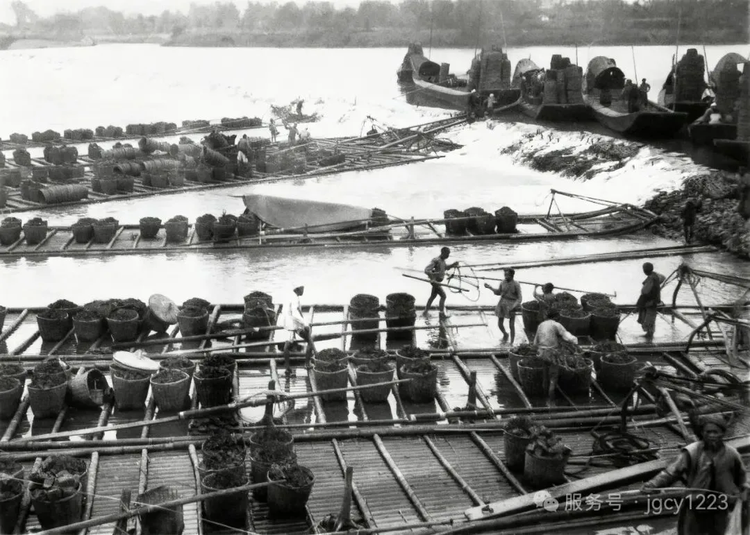 (乐山城的码头和竹排,周鑫 摄于上世纪四十年代)