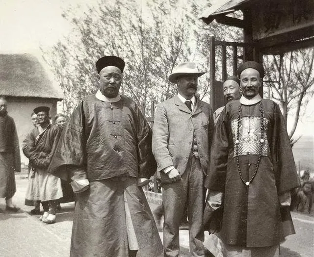 这张画里的穿戴不用细说,左边站着的清朝官员,帽沿子稳当当,圆顶帽外头一撮黑绒毛,那身灰蓝大袍,宽宽绰绰拖着袖子,右边官衣上还趴着一只大绶章,珠串从脖子垂下来,硬挺得很,中间那位西装马甲、巴掌帽,一身毛料衣裳立在那里,草帽檐子底下眉毛扎硬,站一起不用开口,气场就有点“中西碰头”的意思,你说那会历史怎么就装在这一张里了。
