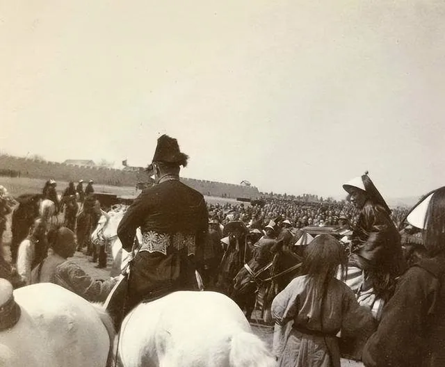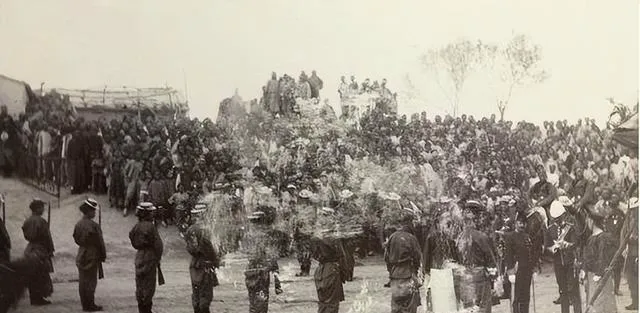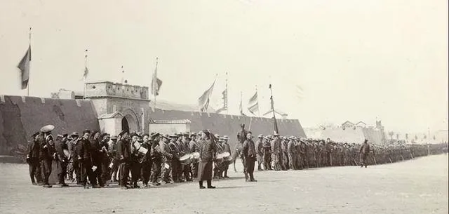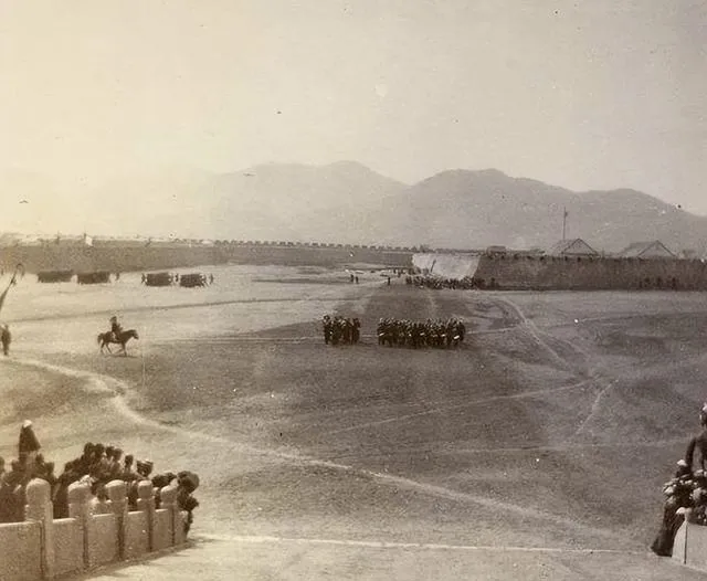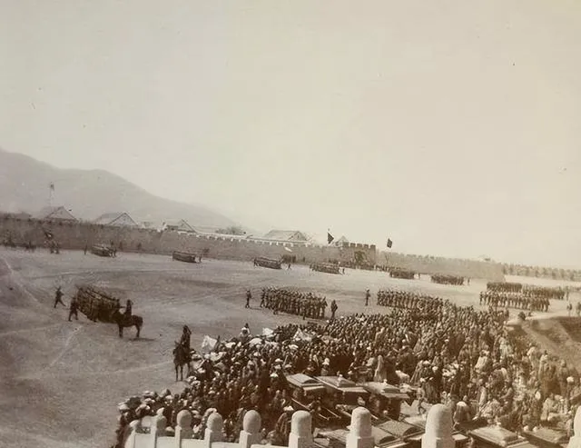 你要说这场面气派不气派,队伍整整齐齐,后头黄土岗子上堆着一大群人,黑压压像捧场,台下是清方兵丁,高顶帽、大袍子、腰间盘扣,各自站成一线,前排是些西式卫队,那种亮闪闪的肩章,屁股后头还别着长弯刀,这种新旧混搭的阵仗,光看阵型心里就有点当年的腔调,爷爷那会也说过,“西洋人来,咱们全镇都赶去看新鲜”。