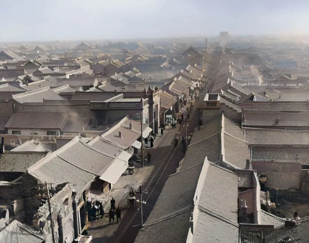 这张是大中楼顶往外拍下去的,成片灰瓦,家挨着家,屋顶像鱼鳞一样铺开,直溜溜一条街穿城过去,左边有人拉车,右边有人唤牲口,路不宽,但每一块地砖、每一面土墙都有人气,小孩玩闹时总疑惑,这么多屋檐怎么找得到自家,妈妈指着晾衣绳和门口的小匾牌说,认路就得记下这些,风一起来,檐角滴水敲得稀里哗啦,家家都趁这动静坐下歇一歇。