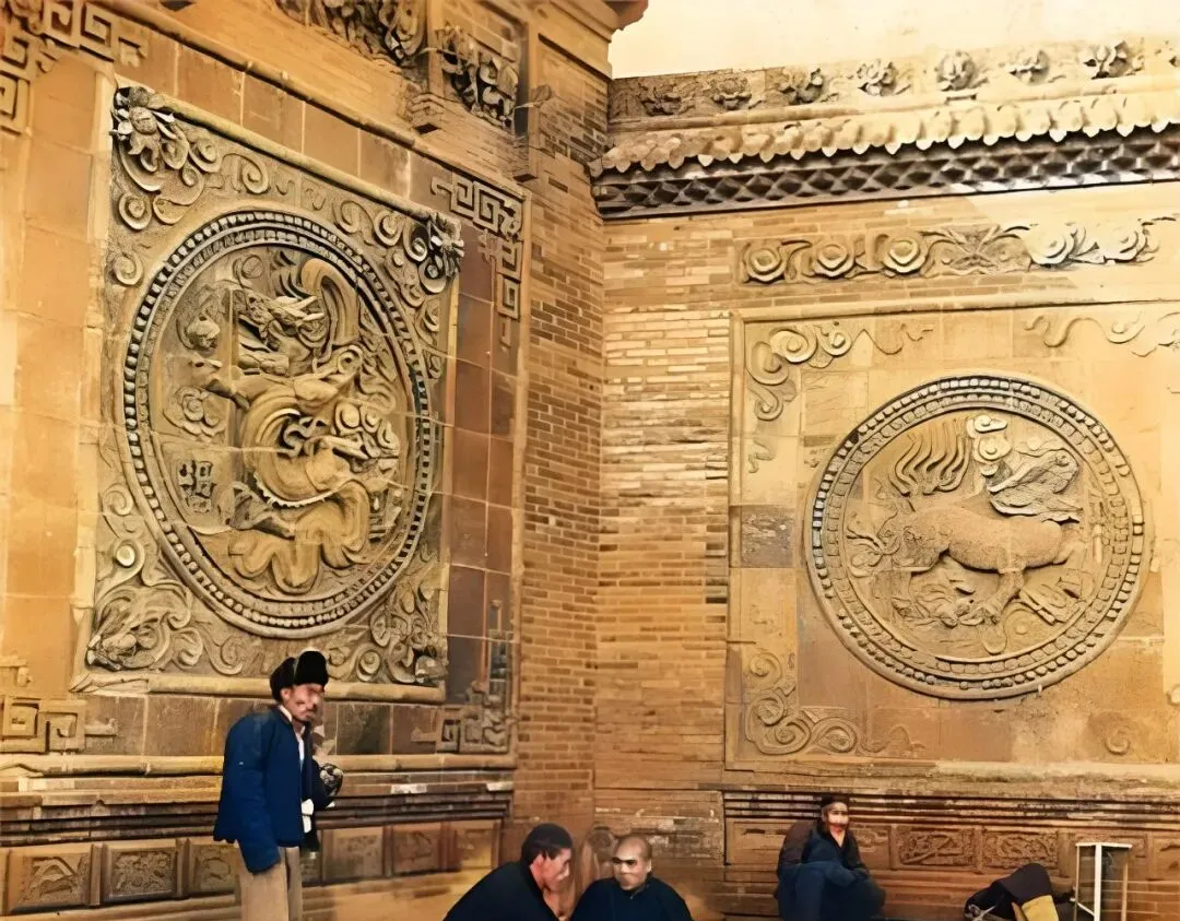图中两大块墙砖叫照壁,砖雕的龙和麒麟,金砖一缝一线全有讲究,小时候总喜欢趴着看,手总忍不住摸一把,碎花纹走了一整圈,地上木屑和香灰搅在一堆,庙会时小摊就挨着照壁摆,边看边吃糖人,嘴里甜得很,家里老人说,这墙讲排场不讲空,越看越带劲。