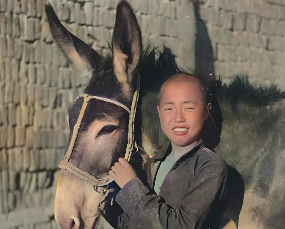 看这小伙子笑得见牙不见眼,一手拽着毛驴绳,驴耳朵竖得可精神,这年代的交通就是它,赶集拉柴全指望,天不亮爬起来牵驴,踩一地细土,回来满身脏,锅台上有热饭等着,日子过得一点不虚抬,每个家里只要有头好驴,那体面可不是小事。