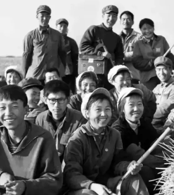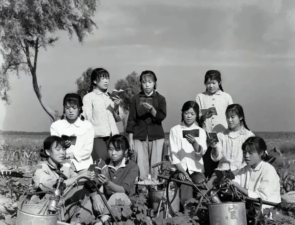 这张照片特别出乎意料。地里放着水桶、农具,自行车也停在一边,一群女知青却拿着小本子在看。有人站着读,有人蹲着看,神情都很认真。劳动间隙还不忘学习,这种画面今天看,真有点不真实。