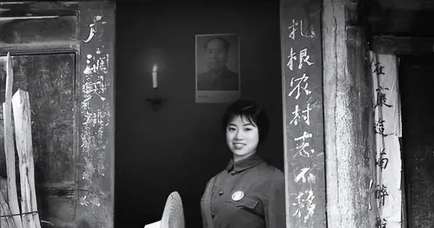 这张照片的味道,全在门框和字上。木门旧了,门联也有点斑驳,屋里墙上还挂着画像,女知青站在门口,穿着朴素的上衣,笑得很轻。