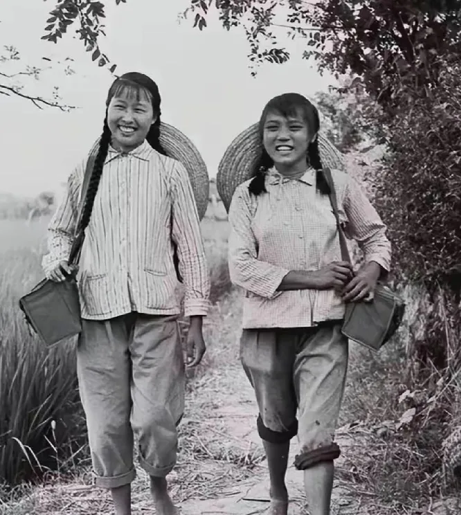 最后这张,确实美。两个女知青走在田埂小路上,背后背着草帽,手里挎着小包,裤腿卷起来,脚下像是刚从田里出来。一个笑得开朗,一个神情利落,辫子垂在胸前,整个人特别精神。
