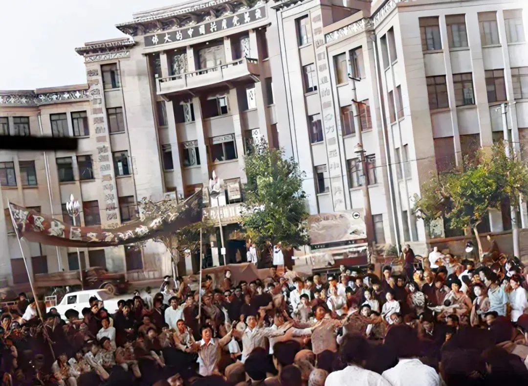广场这热闹场面,你要说现在广场宽敞大气,搁九十年代压根不是那路子,图上是一群人围了一大圈,旗子舞得飞起,小孩端板凳,大人搭嗓门,各种文艺节目或者舞台批斗,谁家有能耐还上台亮两句,上楼还能探头往下看,三层人头一排,挤进去呐喊,那种热气是现在空旷广场比不了的,小时候夹在人堆里,汗臭味都搅一块。