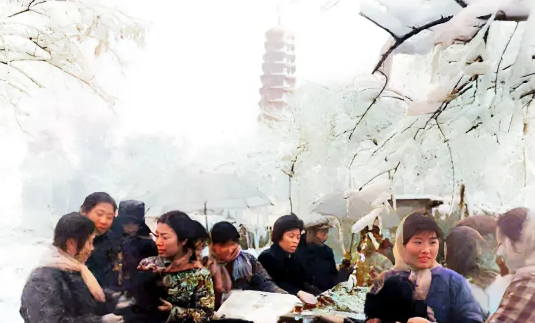 雪后市场,一下风全裹上冰凌,女人们裹大棉衣围桌挑选新棉货,脸冻得通红还不住抬头比厚度,后头文峰塔影子虚虚托在雾气里,一摞摞的菜苞,卖家摊主手套厚得快捏不住钱,小时候妈妈带我去集市买新帽子,回家路上总要不停攥着叫“别掉啊跑丢了”,现在都猫超里按空调选,没了雪里吆喝的鲜活劲。