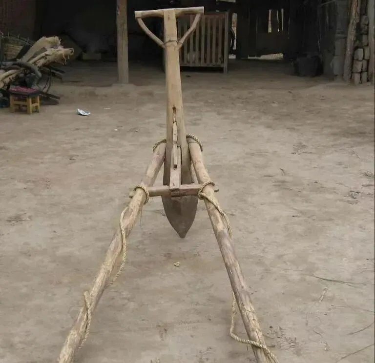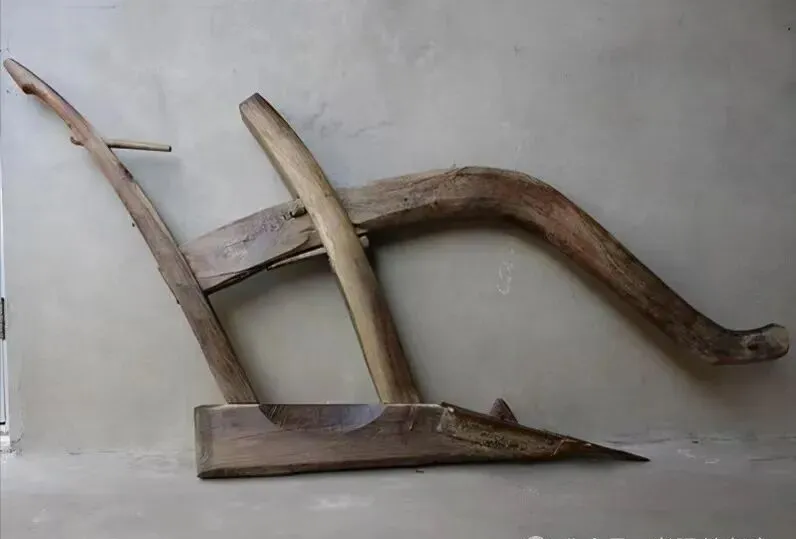 图中这个叫犁,是那种把地翻起来的老家伙,整件用粗硬的木头做成,前头尖尖的犁尖染了黑土,弧形的犁梁有年头的磨光,侧面还钉着铁片加固,牛或马套上绳子拽着走,人扶着犁把掌控方向,那时候村里播种前夕,男人们一队一队下地,我小时候站在田埂上看着土块翻卷,风里夹着草秆和粪的气味。.