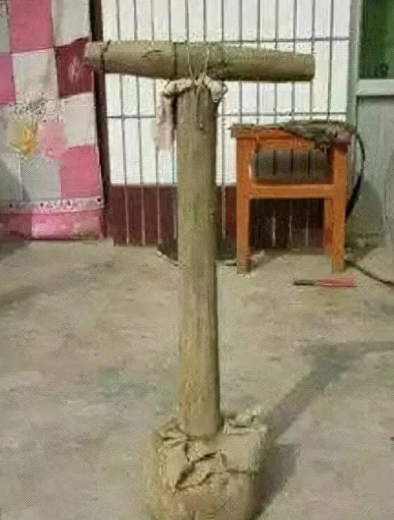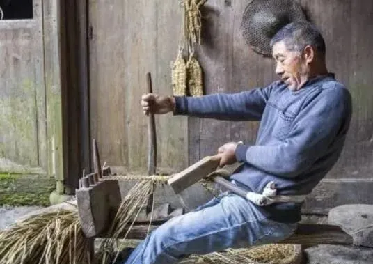 图中这家伙是连枷或者手打脱粒器,前端是横着的木枷,绑着绳子,打一甩谷粒就从穗上掉下来,用功夫和节奏换粮食,小时候不敢靠太近,怕被飞起的稻谷打到,长大了才知道那活儿有门道。.